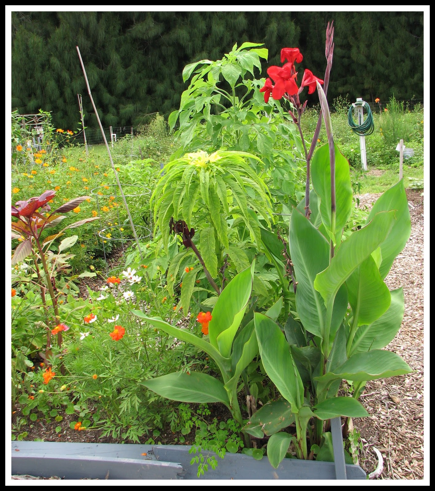 I'm learning a lot out at the community garden. The biggest lesson I'm learning so far is to not fight the zone and the season. A LOT of gardeners here in Florida just call it quits from about May till September as far as gardening, especially vegetables. I grew some beautiful greens all winter here, only stopping with the heat in about March. The summer-loving plants I've learned will enjoy growing in this prolonged heat here are: Amaranths (we grow the edible leaf types), sweet potatoes, poblano and hot peppers, eggplants(!!), yard long beans, and okra. That doesn't seem like much of a veggie crop, but we are trying to grow enough of the amaranths and sweet potatoes to use as an alternative crop of greens during summer months. We're experimenting this summer. The flowers that love the heat are the zinnias, cosmos and the volunteer cannas I've transplanted from the overflow common areas nearby. Oh, and some herbs really love the heat, especially the lemongrass. There's a whole list of things I planted that I had to pull up. I was hopeful for the green beans but they don't care for our summers. The melonworms got all the squashes, too, so maybe next time around I'll know more about using Neem or Bt.
