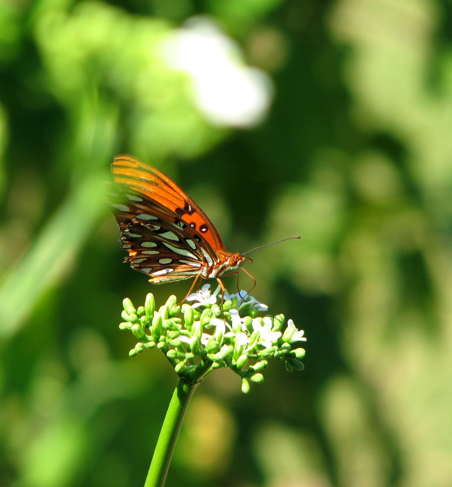 Here's a closeup of a Gulf fritillary, one of dozens surrounding these half-feral stinging chaya bushes with fluttering clouds of color. We initially planted the stinging chayas for their prolific growth of nutritious edible (cooked, never raw!) leaves.  We discovered their modest white flowerets lure certain butterflies...constantly!